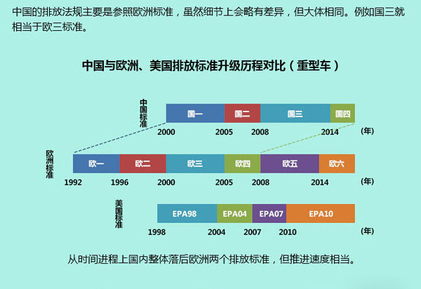 我國(guó)的排放標(biāo)準(zhǔn)主要是參照歐洲標(biāo)準(zhǔn),雖然細(xì)節(jié)上略有差異,但大體相同。例如國(guó)五就相當(dāng)于歐五標(biāo)準(zhǔn)。目前,我國(guó)已經(jīng)到了國(guó)四和國(guó)五切換之際,但還落后歐美一個(gè)層次,而且現(xiàn)在環(huán)境問(wèn)題是全球問(wèn)題,我國(guó)又是車輛大國(guó),排放問(wèn)題受到國(guó)際關(guān)注,所以排放升級(jí)加快是大勢(shì)所趨。