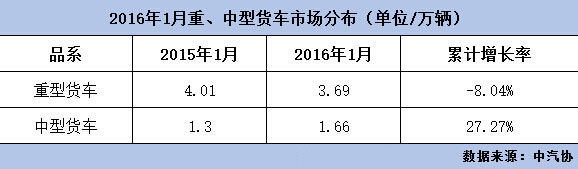 根據(jù)中汽協(xié)最新發(fā)布的2016年1月份貨車(chē)市場(chǎng)產(chǎn)銷(xiāo)數(shù)據(jù),1月份重卡銷(xiāo)量36872輛,同比下降8.04%;中卡銷(xiāo)量16603輛,同比增長(zhǎng)27.27%。從數(shù)據(jù)上來(lái)看,重卡由去年的近三成降幅縮減為8%,中卡更是一改長(zhǎng)久以來(lái)的下降之勢(shì),同比上升近三成,開(kāi)年局勢(shì)見(jiàn)漲。