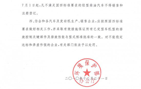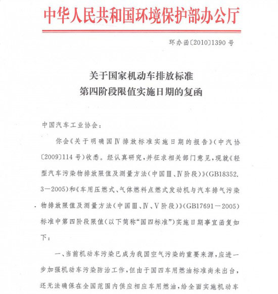 為此,中國汽車工業(yè)協(xié)會在聽取汽車行業(yè)多數(shù)企業(yè)意見和建議的基礎(chǔ)上,向國家環(huán)境保護(hù)部反映了該標(biāo)準(zhǔn)推遲實施的建議。 中國人民共和國環(huán)境保護(hù)部辦公廳于2010年12月21日以環(huán)辦函【2010】1390號《關(guān)于國家機(jī)動車排放標(biāo)準(zhǔn)第四階段限值實施日期的復(fù)函》函復(fù)中國汽車工業(yè)協(xié)會,F(xiàn)將函復(fù)內(nèi)容轉(zhuǎn)告全行業(yè),請行業(yè)嚴(yán)格按照國家要求認(rèn)真執(zhí)行。