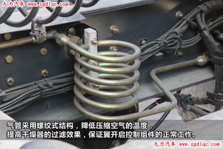 除了顏色,車身配置與之前常見的天龍沒有太大的差別,在大梁內(nèi)小編看到這么一個螺紋式氣管結(jié)構,這種結(jié)構可以降低壓縮空氣的溫度,提高干燥器的過濾效果,保證翼開啟控制組件的正常工作,天龍系列車型已經(jīng)開始推廣此項改進。