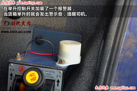 在這輛自卸車(chē)上,我們也看到了這樣的報(bào)警器,就安裝在貨箱舉升控制器上面,當(dāng)貨箱舉升時(shí)就會(huì)不停的發(fā)出報(bào)警音,當(dāng)貨箱放下后停止報(bào)警。