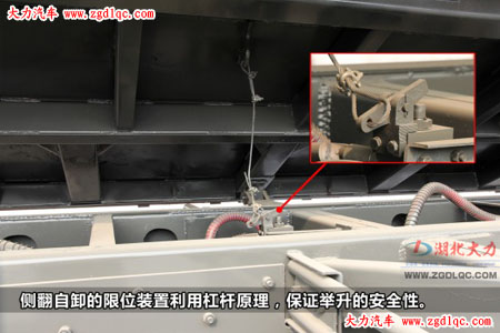 最后我們來(lái)看看側(cè)翻自卸的限位裝置,巧妙的利用了杠桿原理,當(dāng)貨箱翻轉(zhuǎn)到指定位置后,帶動(dòng)鋼絲繩帶動(dòng)圖中杠桿原理,啟動(dòng)限位裝置,保證了舉升的安全性。