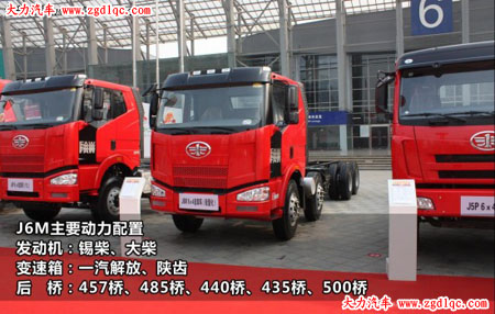 相對J6P,J6M動力搭配較少,主要搭載錫柴CA6DL1與大柴BF6M1013系列發(fā)動機,最小220馬力,最大310馬力,變速箱有一汽解放(10檔)、陜齒(9檔、8檔)品牌可供選擇,后橋匹配13噸單級減速457橋、單級減速485橋、單級減速440橋、輕量化435橋、選裝500橋。