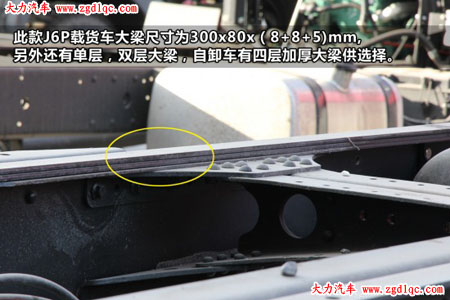 J6P大梁比J6M厚1mm,J6P大梁厚度為8mm,J6M為7mm。具體大梁尺寸(斷面高X翼面寬X板料厚),上圖J6P載貨車大梁尺寸為300X80X8+8+5mm,另外還有單層,雙層大梁,自卸車還有四層大梁的車型,大大提高車輛的承載力,適應重載需求。