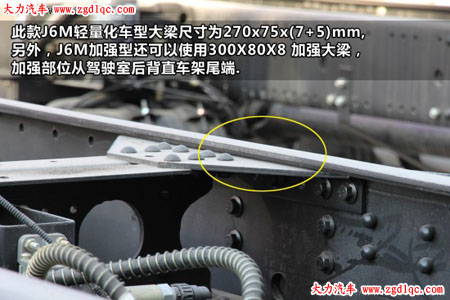 此款J6M輕量化車型大梁尺寸為270x75x(7+5)mm,另外,J6M加強型還可以使用300X80X8 加強大梁,加強部位從駕駛室后背直車架尾端。