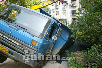 14時40分,記者趕到新村小學(xué)現(xiàn)場見到,一輛藍(lán)色瀝青車向左后側(cè)翻,車上的瀝青一半都撒在地上,被埋在里面的民工還沒有挖出來,一輛救援車試圖吊起側(cè)翻的瀝青車,但因起重力度不夠幾次未成,直到16時才將祝某的遺體拉出送到殯儀館。