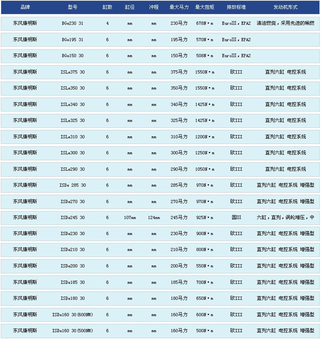 東風康明斯發(fā)動機部分型號圖表